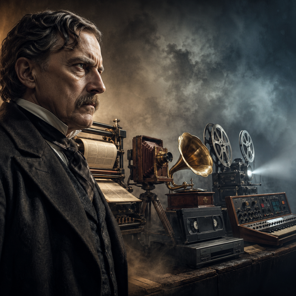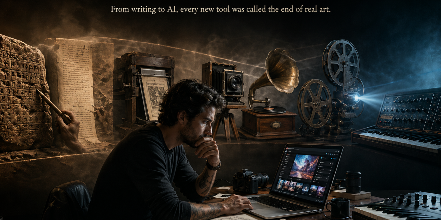 A powerful new tool arrives. It changes who can create, remember, teach, publish, or perform. Then the old guardians of the previous world call it dangerous. They say it will weaken people. They say it will cheapen the work. They say it will replace something sacred with something mechanical.